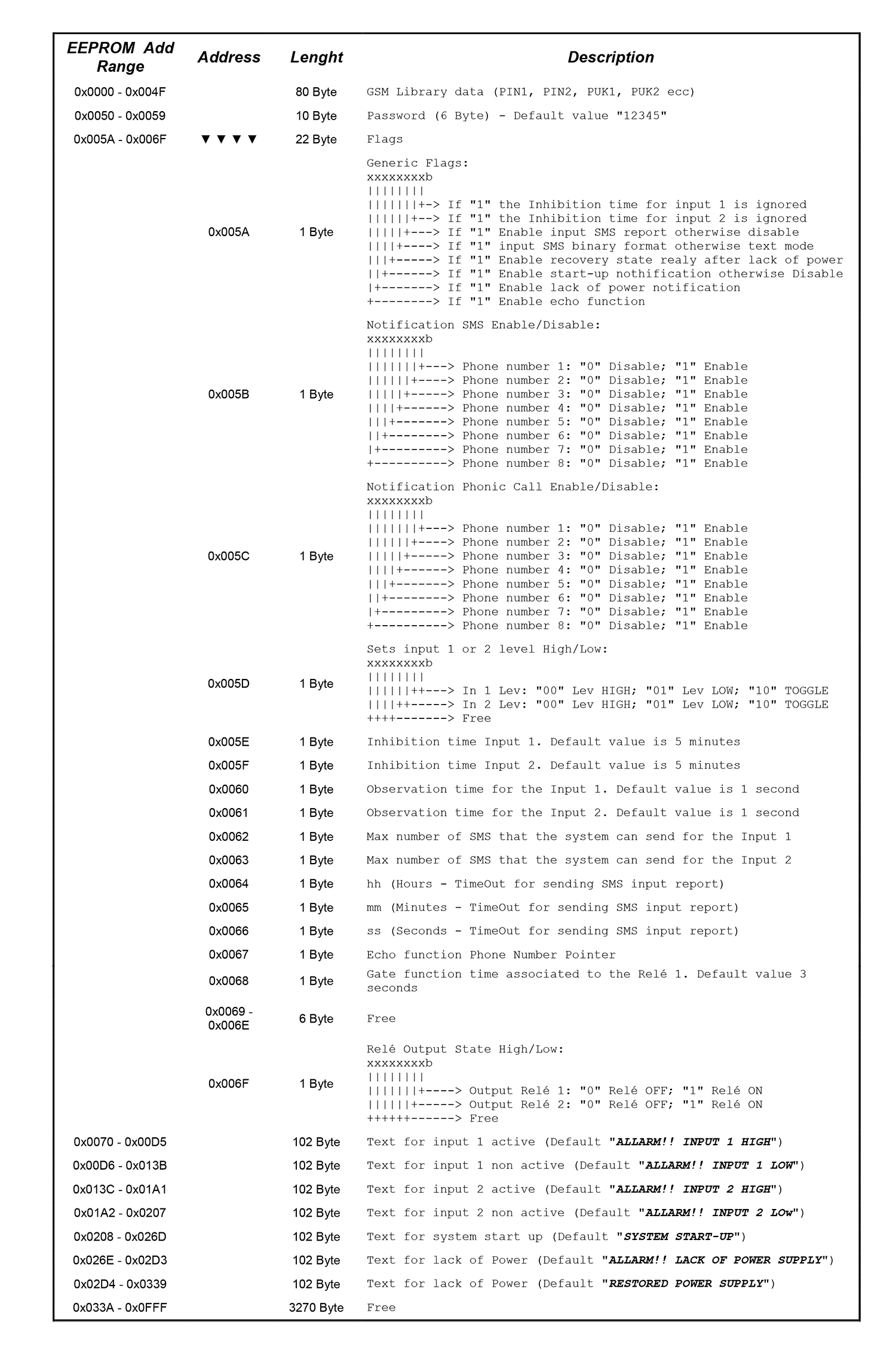 system flags including the enabling of SMS alarm notification and relative voice calls;