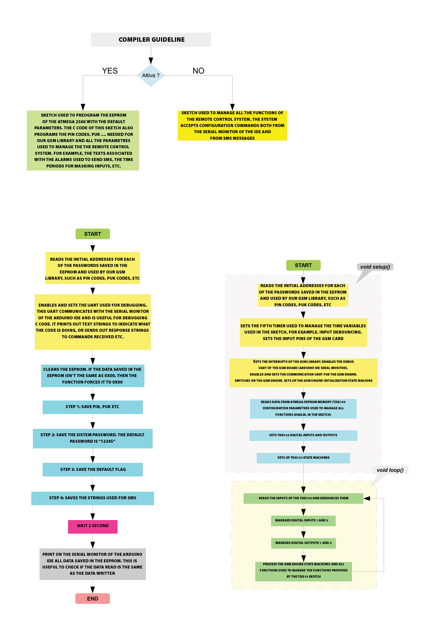Let’s go back to the flowchart of Fig. 3 and study it starting from the function “void setup()” which is used to initialize the GSM library and to preload in memory a series of parameters stored in EEPROM.
