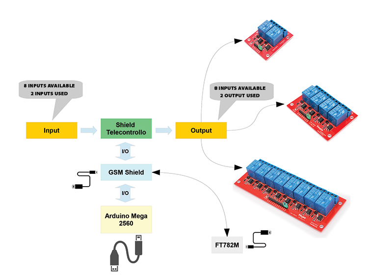 Like the TDG133, this telecontrol provides two digital inputs and two relay outputs. In our application we provide up to eight digital inputs, that can be active at high or low level, and eight digital outputs that can drive up to eight relays; actually, this availability is hardware, because the current firmware of Arduino Mega 2560 allows to manage only two digital inputs and two digital outputs and who wants to use all 8 lines will have to put hands on the code.