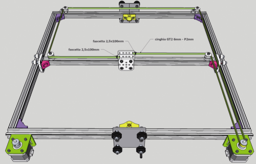 Please place the two NEMA17 motors (the ones for the command of the transportation on the X and Y axes) on the X-Y chassis, and then supply them with toothed pulleys. Please take the toothed belt and divide it into two parts having the same length (about 2.5 m each); then apply it – in this order – to the right motor’s pulley, to the central pulley, and at a later time fix it to the front plate of the Y carriage (by means of a strip). Please stretch out the rest of the belt on the other pulleys, until the other plate is reached: there, it will be fixed, still by means of a strip. Please carry out the same operation with the other belt. The transportation group will appear as in the figure.