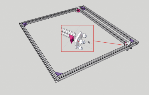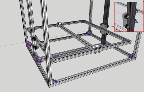 All that is left is to mount the X-Y chassis (that is to say, the one sliding on the Z axis) on the Z carriages we previously applied to the side uprights that act as a guide; we will obtain a situation as shown in figure, in the picture’s detail you will see a Z-carriage from the external side.