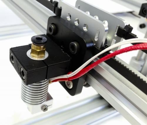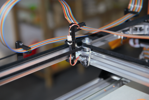 The system we used for moving the extruder is named XY core; you may find more details online, at the following web page. The mechanism at its basis is supplied with two motors that act on the positioning of the print head on the X and Y axes (by means of two different 6 mm pitch 2 mm GT2 belts) at the same time; by using two belts (instead of a very long one) the positioning errors are reduced, since a single long belt is more prone to being deformed, with respect to two different belts (natural deformations will affect both belts in the same way, therefore there won’t be differences between them). The only requirement is that both belts must have the same tensioning.