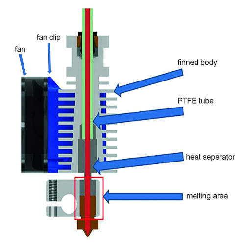 This print head has the filament kept at a temperature that is by far inferior to the fusion one, and at a distance of almost 2 mm from the nozzle, which considerably decreases the unavoidable deformations that would cause slowdowns or even obstruct the interior of the passage. The narrowing placed in the lower part (that joins the heating block to the rest of the body) is the winning solution for obtaining the proper thermal cutting, thus preventing that part of the heat generated from the heating cartridge is dissipated from other parts that are not the veritable nozzle, thus allowing a high reactivity and a yield with a minimal waste energy. The cooling of the print head’s aluminum body is guaranteed by the air flux that is generated by a 40×40 mm (12 Vcc) fan, that is directly applied to it, by means of a dedicated clip (that has been designed in 3D and printed in PLA).