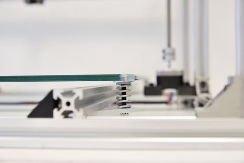 Once the group has been mounted, you will have to act on the four adjustment screws of the glass print bed, so to have it approximately at the same level, and fasten them as much as needed for the springs to be slightly tightened and to avoid excessive swingings (the definitive, fine tuning will be carried out during the machine testing, according to how the printing is carried out).