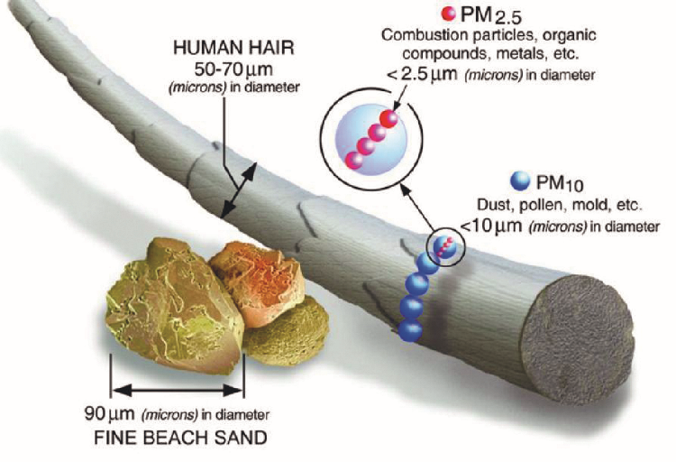 To give you an idea of the concept, Fig. 1 illustrates the size comparison in micrometres between particles of different natures; it is interesting to observe the size of a grain of sand, on average about 90 µm, in comparison with the size of PM2.5 and PM10 particles.
