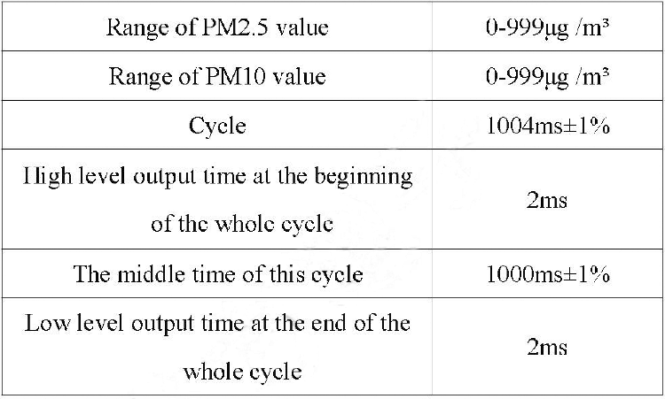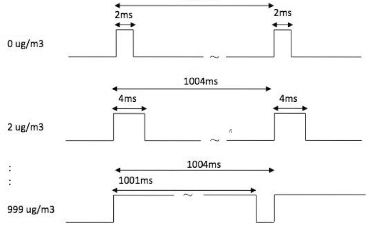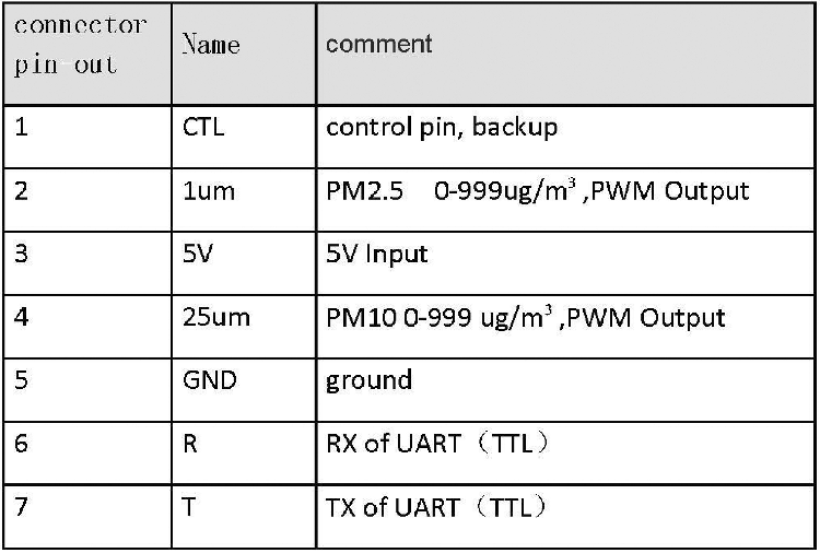 Concerning the measurement of PWM signals the concerned pins are: pin 2 “1um” for PM2.5 particulate measurement and pin 4 “25 µm” for PM10 particulate measurement.