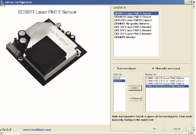 Once COM port appears in “Com List”, press “Add>>” button to associate it to SDS011 sensor in “Device List”. In case no COM port is present in the “Com List”, it is possible to search for a COM port manually by selecting “Manually serial port” button, then select the device in “Device List” and the corresponding serial port that appears in “Com List”, as shown in Fig. 6.