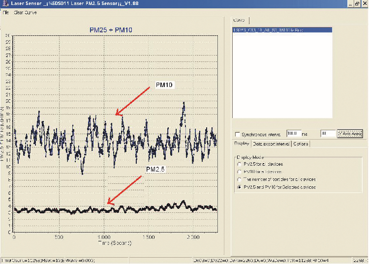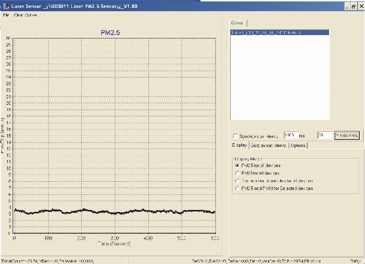 Finally, click on “Add>>”. Once the configuration of the sensor device association to the COM port is finished, click on “OK” to start the measurement program. By default, the PC screen will show the graph of the time course of the PM2.5 values in µg/m³ (Fig. 7).