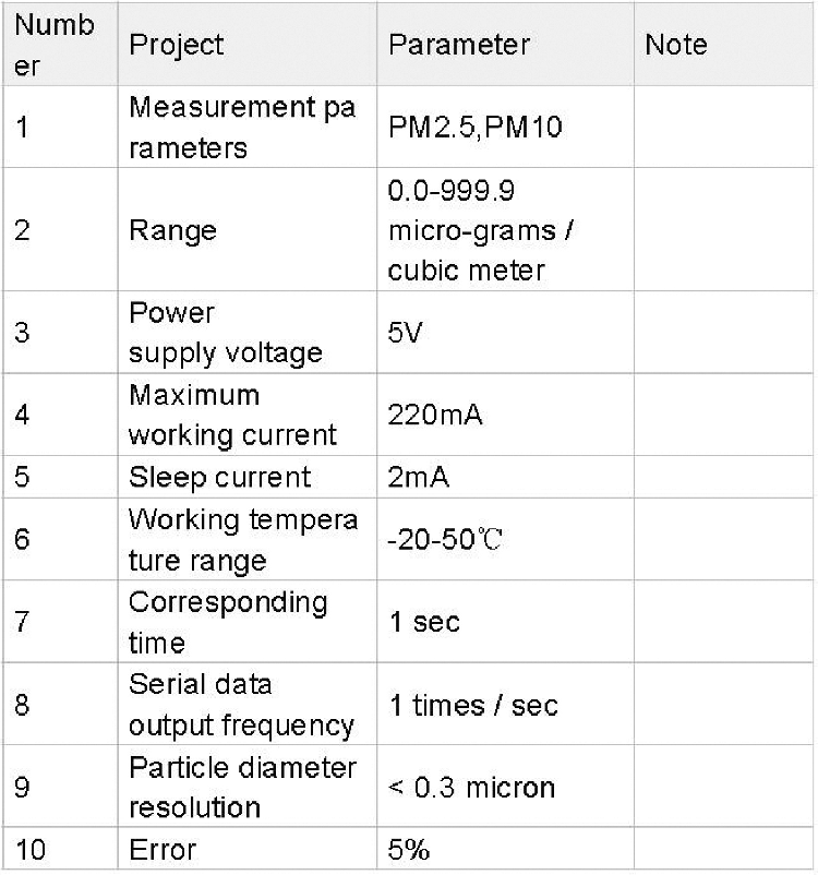 Table 2 shows the technical characteristics of the SDS011. Note the high measurement range of 0 to 999 µg/m3 and the 0.3-micron resolution of particulate detection.