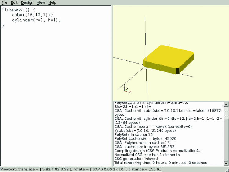 Another application of the Minkowski sum is to obtain shapes with rounded edges; for example, making the sum of a parallelepiped and a cylinder we can obtain a plate with rounded corners: