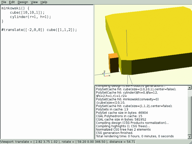 Using these transformations and working on complex models when using slow computers can cause OpenSCAD not be able to complete a compilation resulting in interface freezing: in these cases, just run the compilation by the command line.