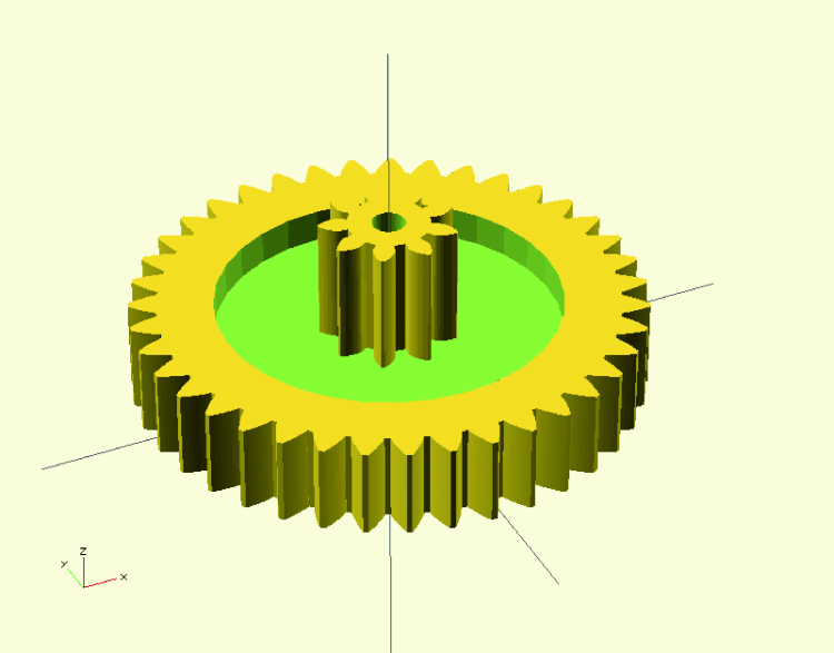 To improve the OpenSCAD drawing precision for fine details requested by our gear components, we will use the $fn=32 special variable; this means that arcs will always be drawn so that a complete circle is made by 32 segments. The central gear part, gear.scad, consists of two toothed wheels with 39 and 9 teeth, one over the other. As seen in the previous episode, the second gear is shifted by a bit less than the thickness of the first, to define intersections correctly.