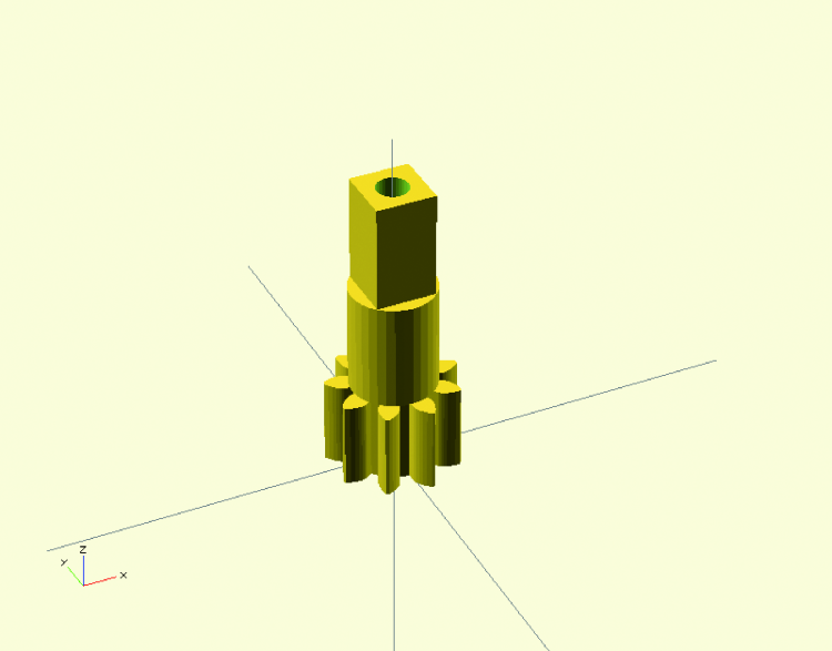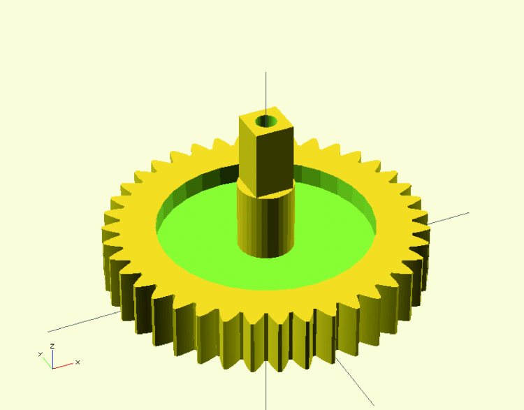 The other two gear parts, gear_small.scad and gear_big.scad are equal to one of the two main gear wheels, but they have a central square hole designed to insert the handle we’ll model later (or anything else we want to use to move the wheels).