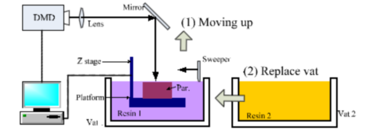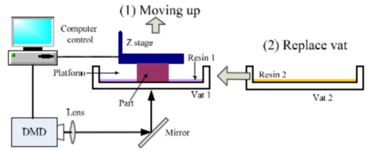 - Projection from the top – that is, the light source is located upon the resin vat.