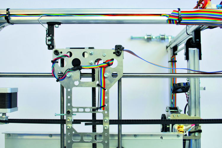 Lay the printer on the Z-axis side, then distend under the base frame the flat cable leaving it near to the motor and to the Z axis limit switch (securing it with cable ties in the most suitable points) separating properly the conductors shown in the diagram in correspondence of the elements to be connected (motors, limit switches).