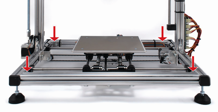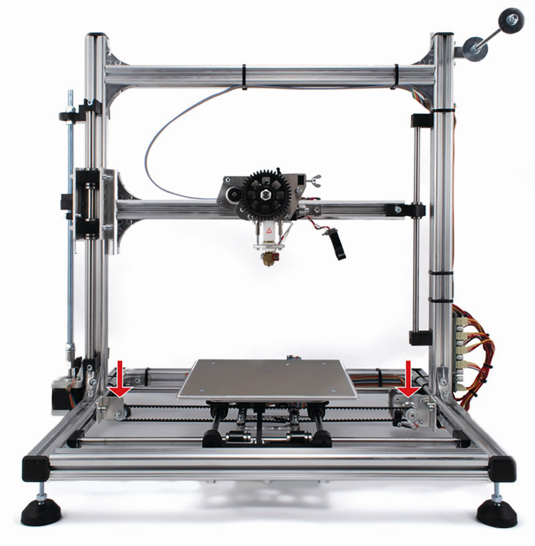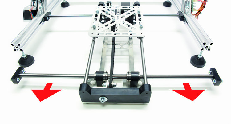 Now you can remove from the base frame the two 45 cm long aluminum profiles (front and rear) indicated by red arrows in figure (to do it, loosen the related angle brackets screws).
