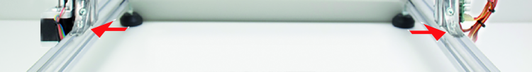 The last operation on printer mechanics consists on positioning the two struts spaced 46 cm from the base front profile. When this is done, it must be double checked that the extruder nozzle is able to reach the two ends of the plate. If necessary, you have to correct the struts positions otherwise you can proceed tightening the angle bracket screws.