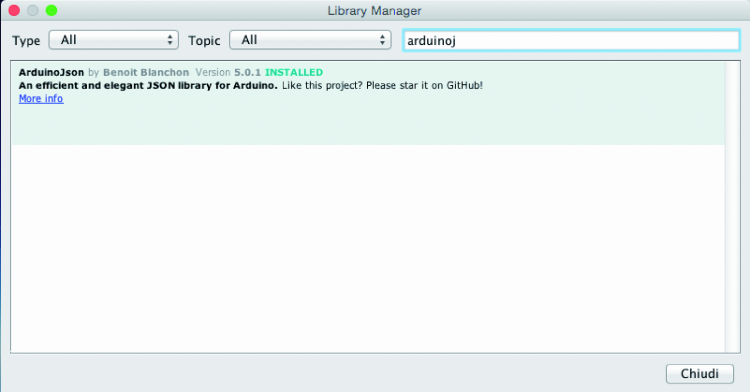 All that is left to do now is to configure the Arduino part: as a first thing we have to download one of IDE’s new versions (from 1.6 and up). Once the IDE has been installed, we have to download ArduinoJson library; luckily in the new versions the LibraryManager has been included.