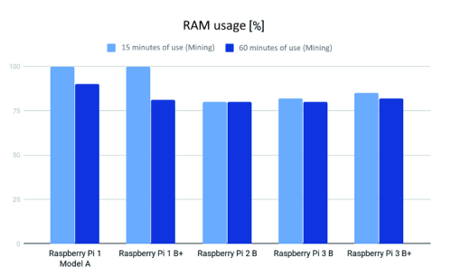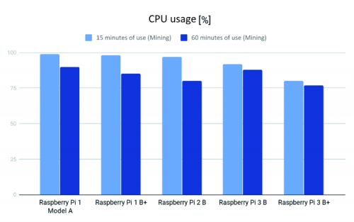 Fig. 4 and Fig. 5 shows how really difficult it is to use the boards to do other things while they are at work mining Bitcoins. It is worth mentioning that the value reported identify cost factors and performance factors of a single board. When browsing on forms, websites, informational blogs etc., you can often find images of a series of boards, especially Raspberry Pis, from different generations, connected to a network switch and working to mine Bitcoin. It is easy to understand that our observations up until now are valid for each of those boards. The fact that they work at the same time doesn’t decrease the consumption of each one.