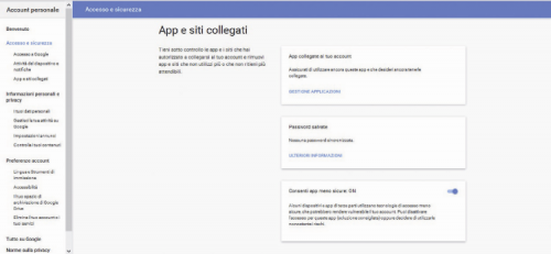 Scroll down until you see Allow unsafe apps: if it’s OFF then you will have to switch the flag ON. This operation is necessary because it allow us to take advantage of the Gmail account in order to send out emails, otherwise Google’s restrictions would block the connection out.