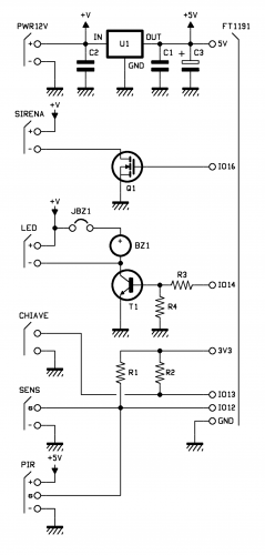 The 5 V voltage goes to 5V and GND pads on the ESP03 demoboard side (connection FT1191 of the circuit diagram). The demoboard then gets 3.3 V stable thanks to its regulator and provides it to the 3.3 V line’s shield, used to power the pull-up resistors of the SENS inputs to which we can connect the sensors with clean contact output or with open-collector transistor referred to the GND contact (-). The inputs are read through the contacts IO12 (in common with the SENS input, used to read clean contacts, and in common with the P.I.R. output, which must be powered by 5 V by U1’s out) and IO13 (CHIAVE input, used to connect the key switch); please note that the P.I.R. has an open collector output, therefore is not relevant unless powered by 5 V because its output provides – at logic level high – the voltage allowed by the pull-up resistor R1.