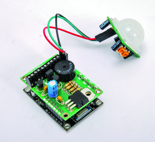 Given the necessity to manage sensors and outputs using the demoboard, we have developed and created an additional shield which is ready for a P.I.R. sensor (movement sensor), a 12 V sound alarm output, and hardware key input (to enable/disable the alarm system) and an output for the 5 V buzzer or LED indicator. The shield has been designed in order to be applied to the ESP03 demoboard; everything is powered by 12 V applied on the shield, which in turn powers the ESP03 demoboard. Having just one power source for everything make the system very compact, as you can see from the prototype photos in these pages.