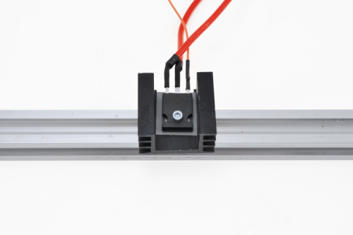 The heat radiator must be isolated via a grey Teflon sheet or via a mica foil, spread on both faces by means of some white silicon paste, since the metal part of the component is in electric contact with the drain terminal, that is potentially positive when the MOSFET is turned on, while the printer’s structure is connected to ground. The dissipator must, therefore, be anchored to one of the base bars, by means of screws and metal triangles. The connections to the MOSFET’s terminals must be isolated by means of a heat-shrink tube, so to avoid short circuits, should it lean on the metal of the dissipator itself.