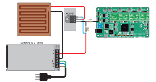 Instead of resorting to a solid state relay, it is possible to command the heated print bed in an easier and cheaper way, by means of a power MOSFET; for convenience’s sake we will choose a P channel one, so that it will be possible to drive it directly by means of the HEATER 2 output (instead of the solid state relay). The corresponding wiring diagram is shown in the figure.