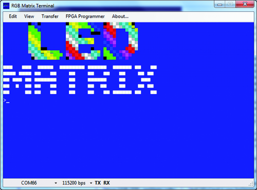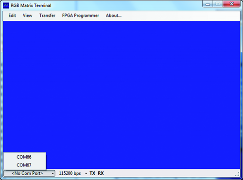 The FPGA configuration is made extremely simple by a terminal emulation program called RGB Matrix Terminal, which is written for this purpose and equipped with many features, and you can see its launch screen in figure. Once launched, in the lower left section of that screen you can find the drop-down menu with the available COM ports; from that, select the one with which terminal communicates (the other one is not used in this application).