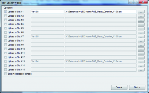 By using the dialogue window that can be accessed from the FPGA Programmer menu, we can check the firmware version that manages our lab tool (it is a file with .bin extension) and possibly update it. To do so, we have to select a slot, name it and, using the rightmost button, we are going to search for the firmware file to upload in the appropriate location (these files must be in .bin format). From the same screen you can also select (with flax) which of the uploaded firmware is will have to automatically launch when the LED matrix board is activated. After uploading the firmware we want, we can now finish our frequency meter/clock generator.
