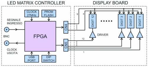 And a programmable logics is also what is at the base of the Led Matrix controller board that we have proposed in the “big modular display” project presented in this post, where we stated that the same board could be reconfigured to carry out many other tasks, including a frequency meter, given the availability of BNC connections and the hardware support for frequencies revolving around 400 MHz.