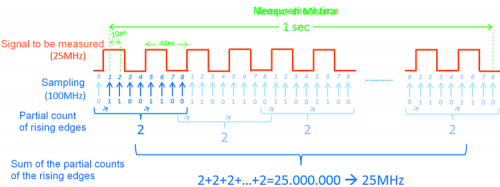 Finally, we have to add all the partial counts for a total time of one second in order to obtain the number of 0 – 1 transitions of the input signal took place within one second, i.e. the frequency.