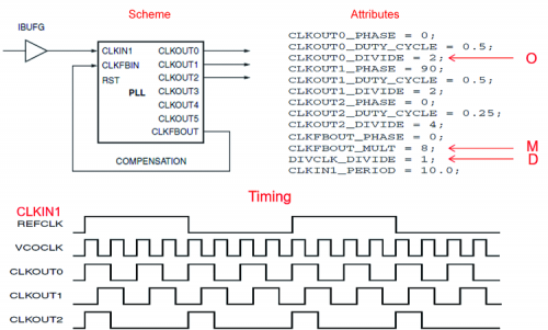 Before analyzing the block diagram, we must briefly talk about the 2 modules included into the Xilinx library: Phase Locked Loop (PLL) and Serializer-Deserializer (SerDes). The first PLL allows to generate, starting from the reference input clock, one or more output clocks with frequency values, face values and duty cycle values that can be configured through appropriate attributes. As illustrated in the example, from the input clock CLKIN1, equal to 100 MHz (as specified by the attribute CLKIN1_PERIOD=10 ns we can generate the output clock CLKOUT0, which we can see can be calculated following this formula below: