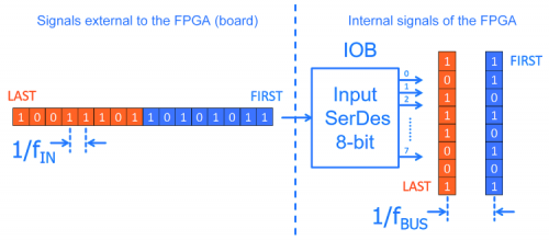 The second module, Input SerDes, located in every input-output block (IOB) of each FPGA pin, allows to turn a high-speed serial input signal in a parallel internal bus (2, 4 or 8-bit) which fBUS is equal to the frequency of the input signal fIN divided by the amplitude of the bus expressed in bits, as visually shown in figure where fBUS=fIN/8.