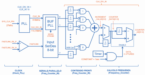 - FREQUENCY CALCULATION: the difference (COUNTER_HZ) between the accumulation of INCREMENT_VALUE signal and the accumulation saved 1sec before it represents how many rising edges of FASTLINK took place within 1sec, that is to say the frequency for FASTLINK.