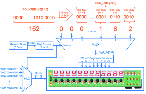 - BINARY TO BCD: the binary signal (COUNTER_HZ) is converted in a signal with 10 decimal digits, one for each display (for instance, suppose we have counted 162 0 – 1 transitions for the signal to measure, that is COUNTER_HZ=10100010b = 162; therefore, on display 0 we would have to display the figure BCD_Data[3:0]=2, on display 1 the figure BCD_Data[7:4]=6 and finally on display 2 the figure BCD_Data[11:8]=1, while 0 will be displayed on all the others);