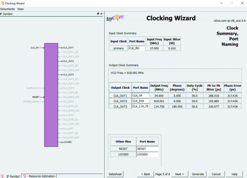 Before getting to the bitstream generation (please remember that when we talk about FPGA, the firmware is called bitstream) to configure the FPGA in the ISE development environment of Xilinx, let’s move from functional description to RTL description through the VHDL code that allows defining the behavior of the circuit in terms of signals, registers and Logix operations. As shown in figure the “TopLevel_LED_Matrix” entity is composed by four components: CLOCK_PLL (clock generation), Freq_Counter_IN (serial/parallel conversion and edges count), Frequency_Counter (frequency calculation and bin2bcd conversion), Seven_Segment_Driver (display selector). Let’s see together some crucial sections of code. The Clock_PLL entity has been generated using the Xilinx CoreGenerator utility allows to automatically configure the PLL attributes after specifying input and output frequencies as shown in the Clocking Wizard in figure. In particular, CLK_IN at 918MHz is used to sample the signal to measure, while CLK_DIV_IN = CLK_IN / 8 = 114,75MHz is the main clock controlling the entire FPGA Logix. The Freq_Counter_IN entity contains 2 4.bit SerDes inputs connected in cascade to pass from serial signal FAST_LINK_RX to 8-bit parallel bus iserdes_q, and the process “Rising edge counter” to count each clock cycles and transitions from 02 1. In List 1 we propose a code for the FPGA called Freq_Counter_IN.vhd, only the section (due to space) implementing the transitions detection.