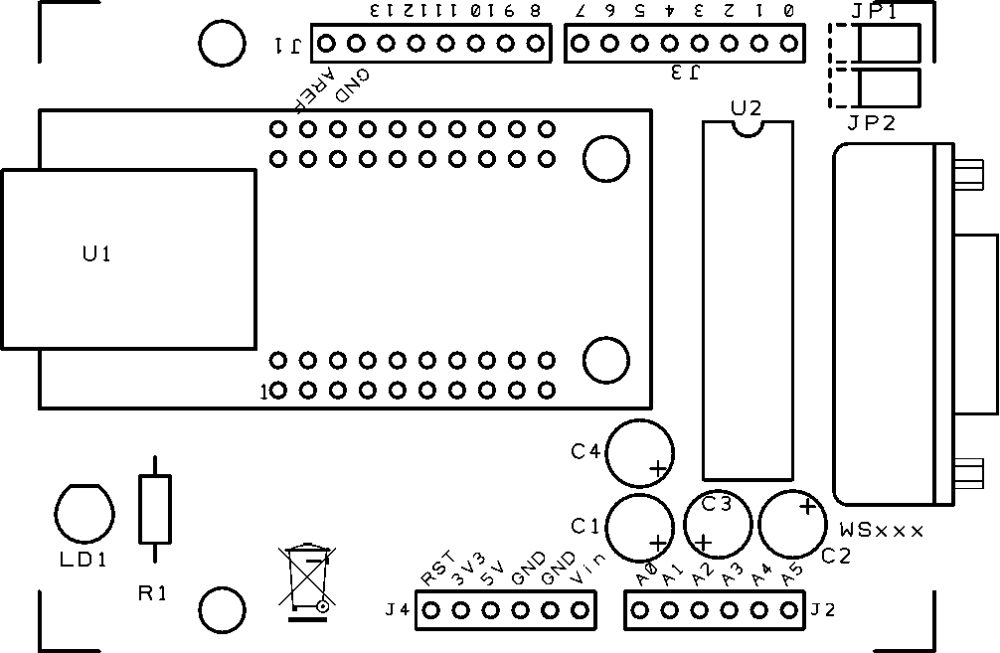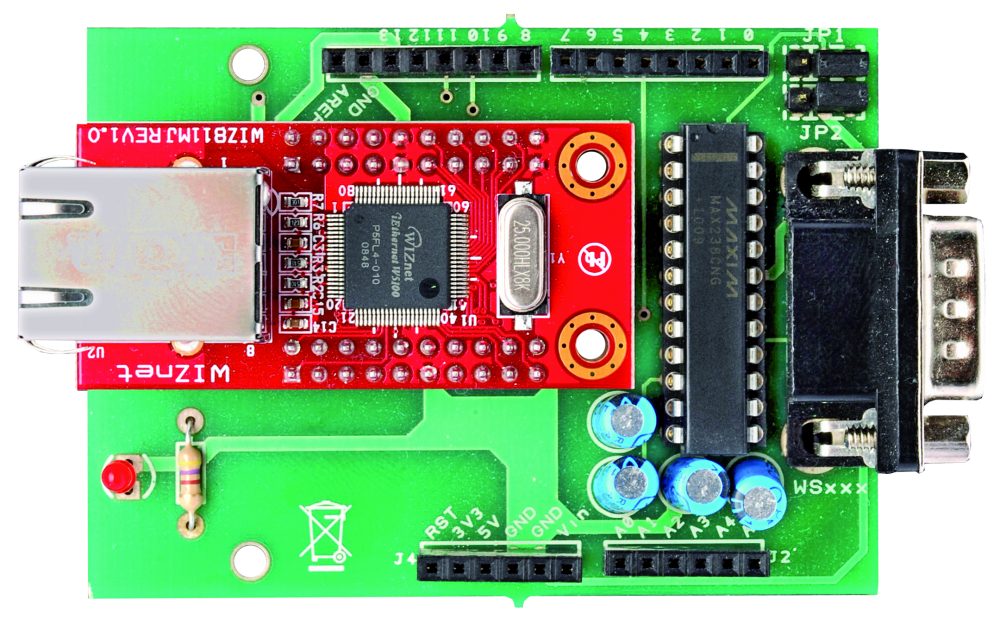 R1: 470 ohm C1: 1 µF 100 VL C2: 1 µF 100 VL C3: 1 µF 100 VL C4: 1 µF 100 VL U1: WIZNET U2: MAX238CNG LD1: led 3 mm red - socket 12+12 - Strip male 3 via (2 pz.) - Jumper (2 pz.) - Strip female/male 6 via (2 pz.) - Strip female/male 8 via(2 pz.)