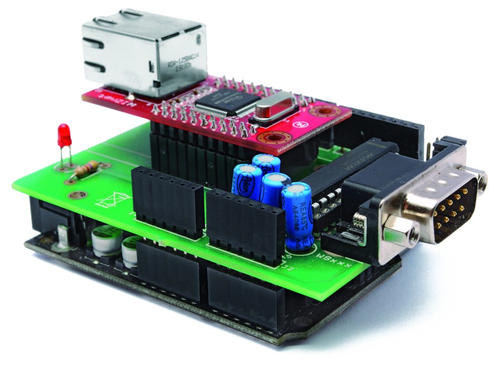 The system has two circuit: one is the famous Arduino UNO and the other is a shield that integrates the Ethernet module WIZnet (you may, of course, use the the original Ethernet Shield), as well as a TTL/RS232 logic level converter MAX238 type. The converter allows you to adapt the serial levels of weather station to the TTL levels of Arduino.