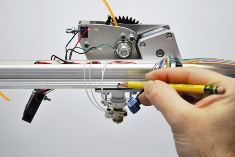Please remember that, if you are using a Nema17 motor – whose cables have been shortened (for example, as in the one that has been recovered from the standard extruder of the 3Drag printer) – in order to reach the clamps it is needed to extend the related conductors by means of a part of the 4 way flat cable that is included in the 3D Choco modification kit: in this case we recommend to pay great attention, in order to avoid the inversion of the connection, since it would cause damages to the related driver. This being said, please group the motor’s conductors by means of strips and fix the wirings to the arm by means of strips in excess .