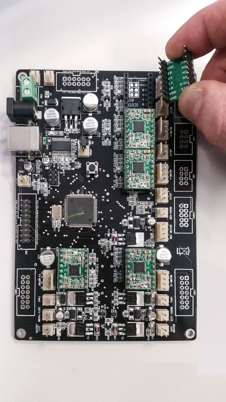 Please remove – by means of a ceramic screwdriver – the drivers of the motors of the old board and insert them in the corresponding connectors of the new one, and add the needed one and drive the motor of the second extruder for the chocolate.