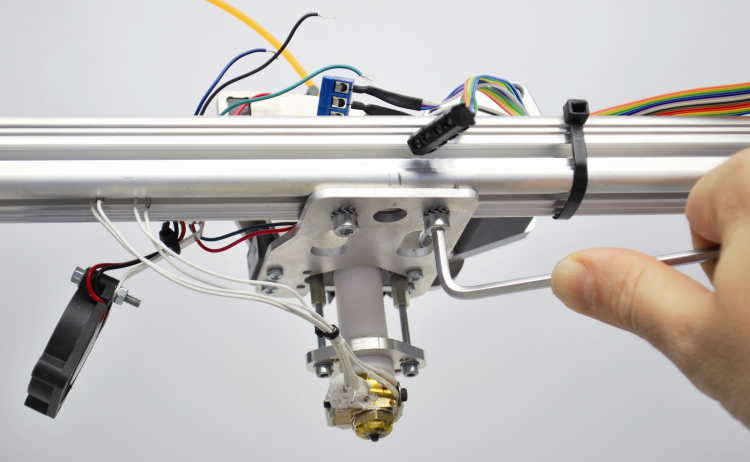 The following operation regards the removal of the existing extruder body, that has been fixed to a suppor that, in turn, is applied to the horizontal arm of the printer by means of two M5 screws. Before the removal, please leave a sign – by means of a pencil – on the printer arm, so to remember the original position of the nozzle (the sign must be placed in the center of the stirrup that supports the extruder), so to allow the correct positioning of the syringe’s needle and to allow to place the extruder in the correct position again, in the future.