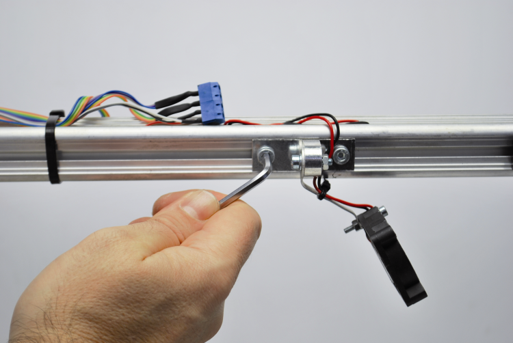 please loosen the two fixing screws of the fan, so to move it on the right end of the arm, as needed in order to allow the assembly of the new extruder.