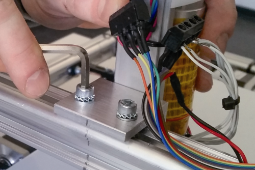 We now have to mount the second extruder for the chocolate, that will be placed on the side of the horizontal print head holder that is opposite to the one in which you mounted the first one: please cut the strip that blocks the flat cable in the part of the extruder for the chocolate, after that please loosen the screws of the extruder’s support and move the extruder towards the motor of the Z axis, and align the final part of the support with the sign that you previously left with the pencil.