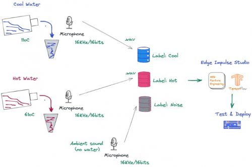 As you see in the video you can do it, but why? It is mentioned that the change is due to complex fluid dynamics reasons. Beyond the scientific investigation, the question we asked ourselves was: is this ability to “listen to temperatures” something that can be replicated using Artificial Neural Networks? We then tried to create an experiment using TinyML (Machine Learning applied to embedded devices).