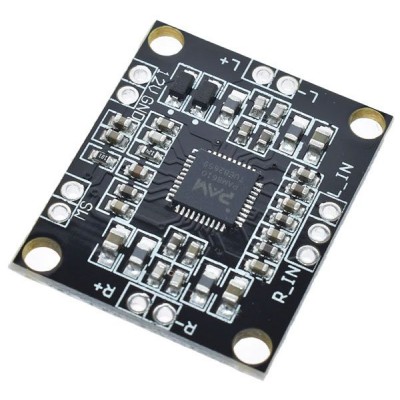 Based on the PAM8610 chip, this small Class D stereo amplifier module is capable of delivering a maximum power of 10 watts into 8 ohms and 15 watts into 4 ohms. Power supply: 7 to 15 VDC (12 VDC recommended), idle consumption: 20 mA, efficiency: 90%, frequency response: 20 Hz to 20 kHz, dimensions (mm): 30x25x3, weight: 2 grams. Particularly suitable for use with small MP3 players.