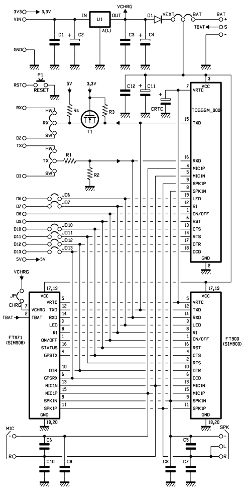 We begin with the supply circuit a simple LM7805. To work, it is necessary to provide an input voltage between 7.5V and 12V. As shown in the circuit diagram, the input voltage, after being stabilized at 5 V, is reduced to 4.3 V by using a diode and provide power to modules that need a voltage between the 3.2 and 4.8 V. During the operations such as the use of GPRS, the module absorbs a current of about 1 A, therefore it is necessary that the power source is able to provide this current intensity.