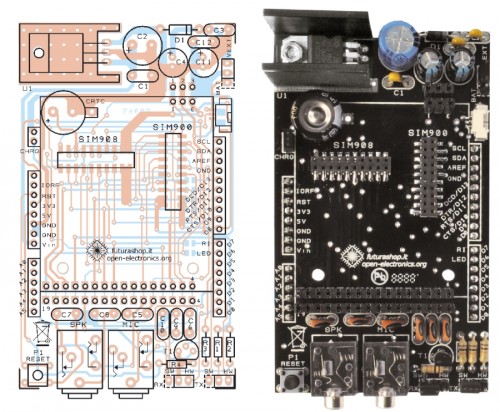 Comparing the new card with the previous one, you can see the presence of two connectors on the top.These additional connections allow the use of the shield also with the new small breakout for SIM900 and SIM908. The new module Simcom SIM908, is characterized by the presence of a GPS with 42 channels.