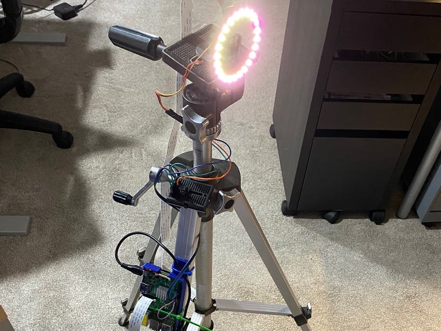 The author of the project, not having a suitable video camera, decided to use a Raspberry Pi. Several tests were carried out regarding the camera but in the end a Raspberry Camera V2 was chosen. Finally there is a ring of RGB LEDs placed around the camera lens.