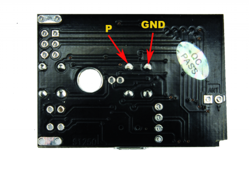 In order to identify the keys pads, you can use Fig. 5 as reference, where the PCB is shown from the solders side PCB indicated by the arrows (the bottom contacts correspond to the top ones); in the aforementioned picture, GND is the ground context of the key while P is the hot terminal, the one piloting the circuit and corresponding to the collector of Q1 transistor from the diagram shown in Fig. 4.